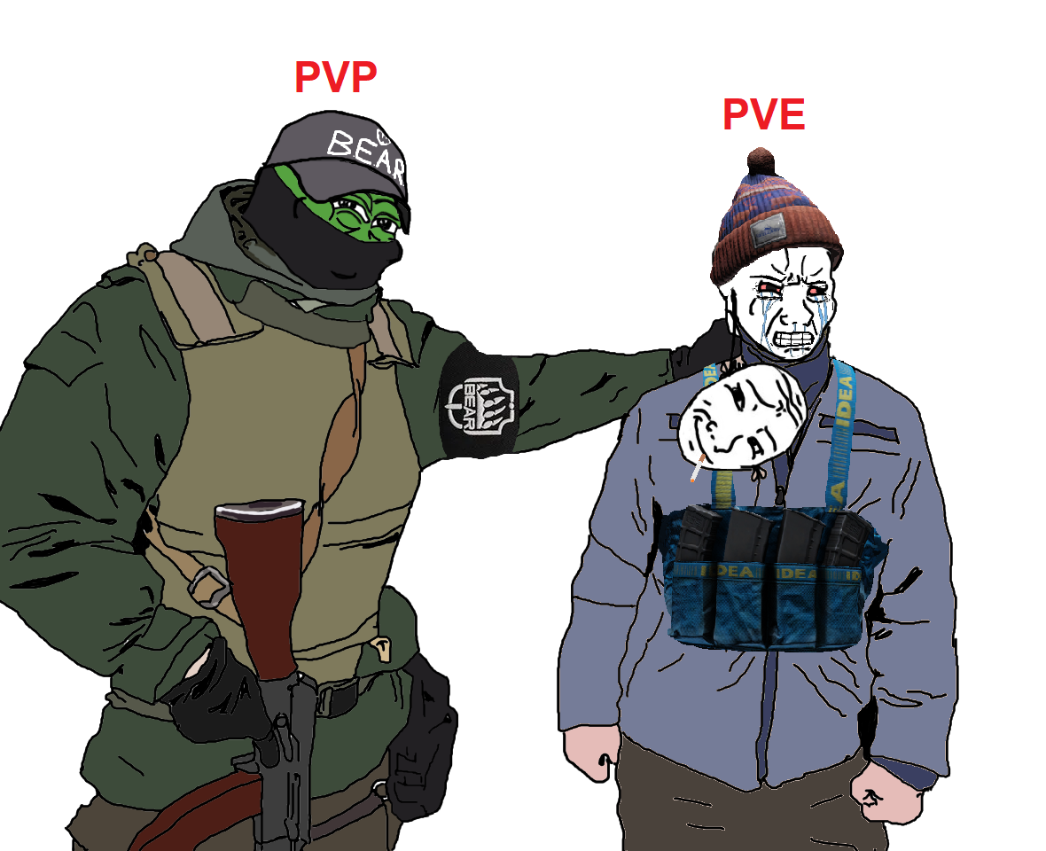 За 2 дня ПВЕ дошел до прогрессии ПВП которое заняло неделю. Чо хочу сказать. Нахуй ПВП. в ПВЕ файты веселее ебать, челы бегают, сникаются, идут лечиться за угол, орут чот там, бродят по тихому почти как живые люди, да еще по двое бродят, мне даж нравится, игра стала выглядеть как реально шутанчик, там обойти, там почекать, много веселых ситуаций где 3 ебана в углу сидели, или в лесу наткнулся на 2 чвкбота, а у меня пукалка 4 зарядная, в итоге минут 15 бегал от них туда сюда, успел бота вместо них вальнут по ошибке, выбегаю за угол горки а там чвкбот стоит лечится и снова ебашит мне в жопу, и так раз 5, пока наконец не умер. Чувствую что игра в ПВЕ режиме выглядит гораздо более сюжетной чем пвп. Чвкботы чот там сражаются с ботиками дикими, пиздятся, ты прибегаешь на этот фан и можешь даже чот пострелять, а в ПВП это просто заканчивается пуком в ебало крадись ты хоть 10 лет туда. На заводе бегаешь диким, боты разьебывают чвкшников, лутаешь с них гига лут - опа, бесплатный гир в рейды, я впервые бля в жизни с Рсаса пострелял ваще, в пвп такие пушки брать я бы жабу задавил в горле. А тут похуй, налутал бесплатно, потерял бесплатно. В ПВЕ по кд бегает по лесу Партизан какой то, я его в пвп ни разу не видел. Короче, круто. Надо было сразу туда идти и не морочить себе башку. Кому сложно, пиздуйте в ПВЕ, там меньше душки и реально больше удовольствия от игры. И нихуя не просто, чвкботы дают в ебало дай боже. В Эпицентре с 5 этажа стрелял в чела метрах в 200, а он мне в дырку наяривал запросто так, я аж охуел что так бывает. ПВП инжоерам удачи там, наберёте.