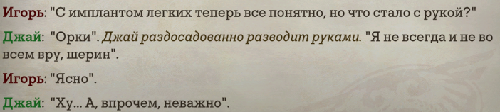 >>50565920 >Вместо них дают максимально уебищного и убогого уралона. Охуенно же, он запиливает прохладные о том, как он дошел до жизни такой? Подробности его тёрок с Кальказаром, из-за которых он все проебал? (Квеста, я так понимаю, у него нет?)