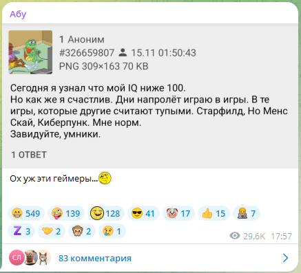 >>50447564 Помню пытался выйти с ним в конструктивный диалог, сравнивал игры, оценки игроков, пусть даже не точными данными, а совокупностью косвенных признаков, показать ему, что он ошибается, и что Старфилд преимущественно никому не понравился. Но там ещё на первых шагах, ваще пизда, фляга засвистела. Начал заливать про ботов, про накрутки, про заговор, лолблять. То есть у чела нет объективной реальности, у него есть своя желаемая цель и позиция, и уже под неё подгоняется реальность. Удобное принимается, неудобное игнорируется, а там где совсем уже не клеится начинается фантазия и конспирология. Ну натуральный шиз. После этого понятно, что разговоры бессмысленны. Но зато теперь у меня есть тред-туалет, куда можно прийти и насрать что-то в духе "Сралфилд это кал малой", и клоун-горбун сразу же прибежит за тобой убирать и рассказывать анекдоты.