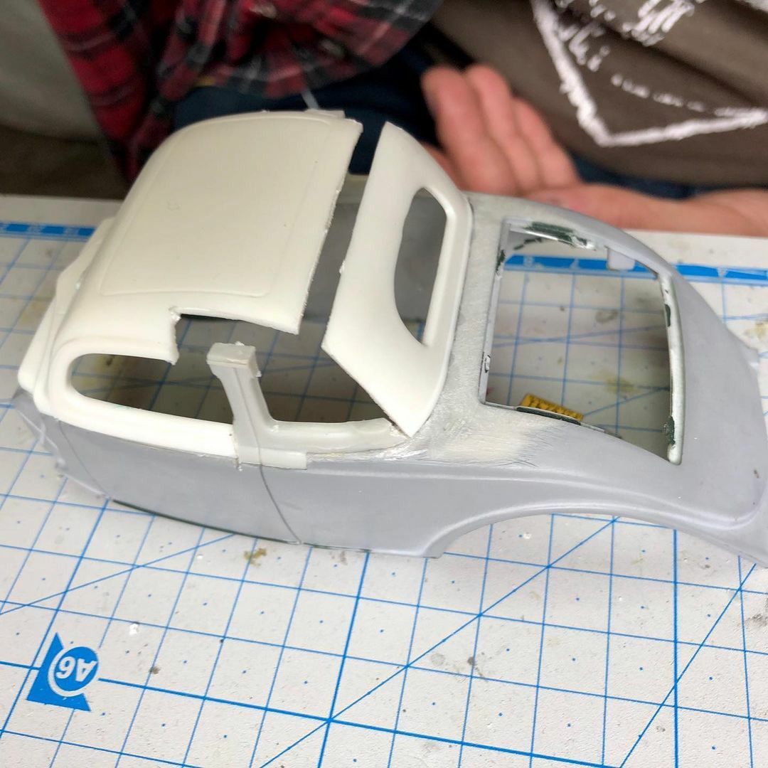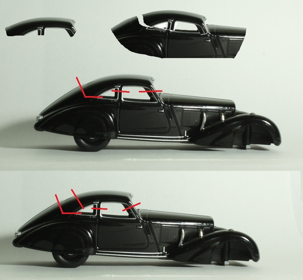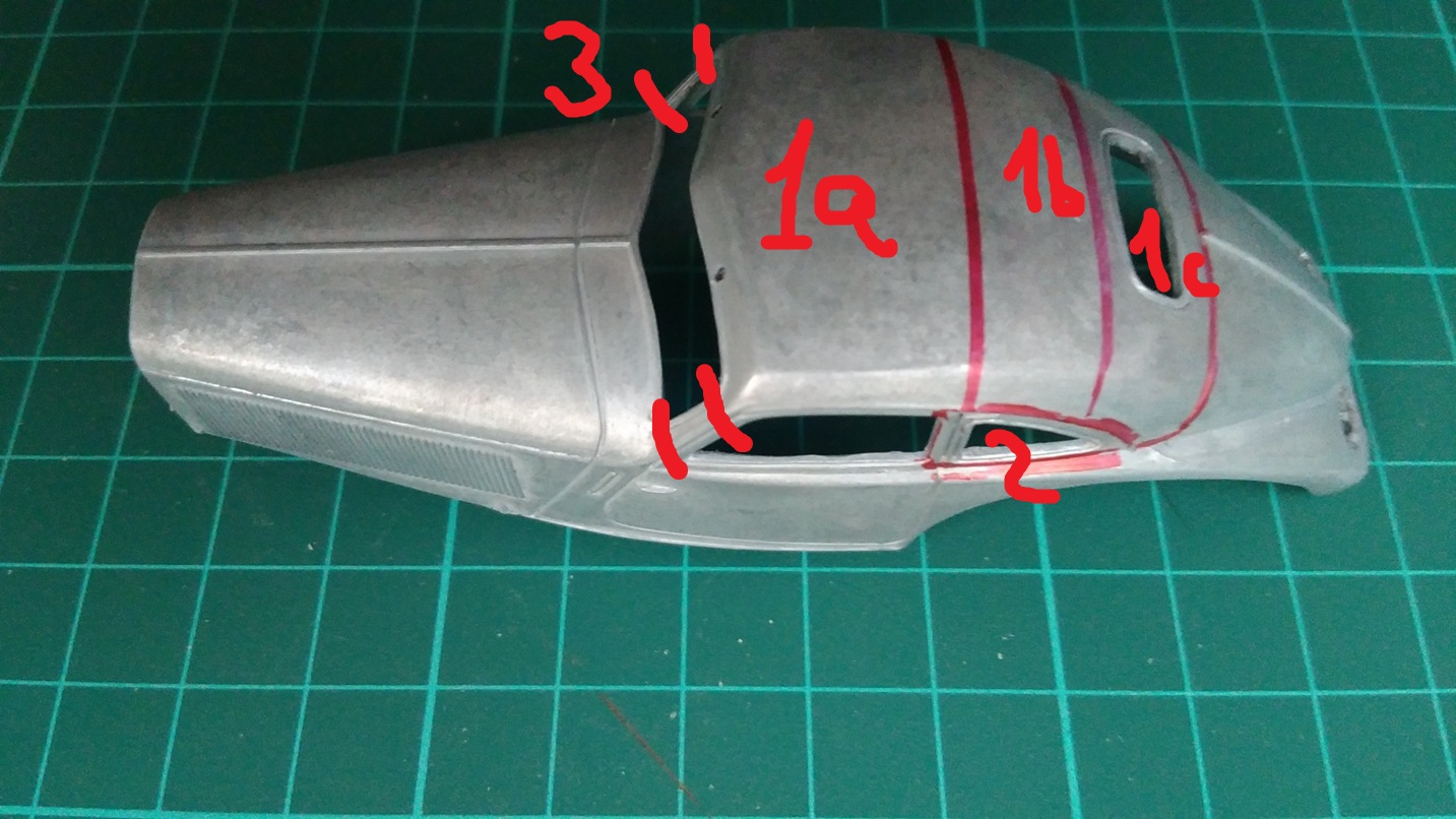 Пока план реализации чоптопа следующий: 1) Разрезаем крышу на пикрил части. 2) 1а выставляем по желаемой высоте. 3) Режем стойки 3 под новую высоту, присираем. 4) Подгоняем 1b и 1с, меняя угол наклона, присираем. 5) Разрезаем задние оконца 2, подгоняем под новые высоту и угол наклона, присираем. 6) ПРОФИТ