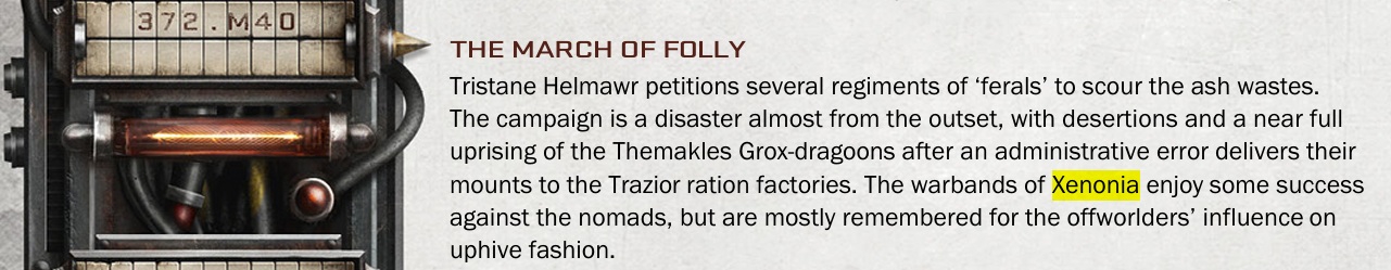 Скваты Конфедерации Урлиш по наводке Лиги Норгир прибыли на Некромунду после окончания Ереси. Орис Железноглаза заключила с правителями планеты договор: стабилизация и восстановление планеты в обмен на постоянные старательские права. Так скваты тринадцати кораблей класса бастион стали (тринадцатью?) шахтерскими кланами Некромунды. Все это, а также судьба Ядра Предков Железноголовых, ленд-трейны и многое другое, ждет нас в бековой части гномокнижки.