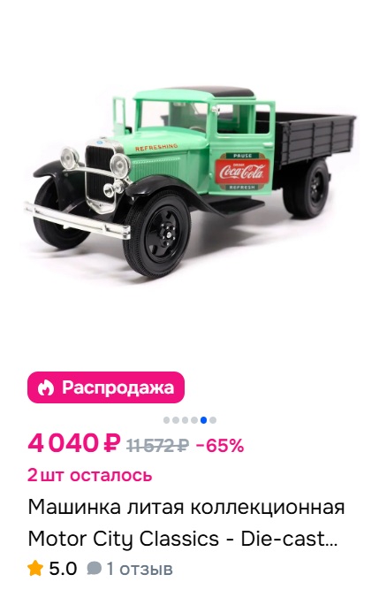 >>1116663 >Конечно, нужны игрушки типа инерционных машинок, всирать полноценные масштабные модели на это слишком жирно. Давненько в магазинах игрушек не был, но в моё время ретро-автомобили были только в виде моделей на полку, детям для непосредственно игры они были явно не интересны.
