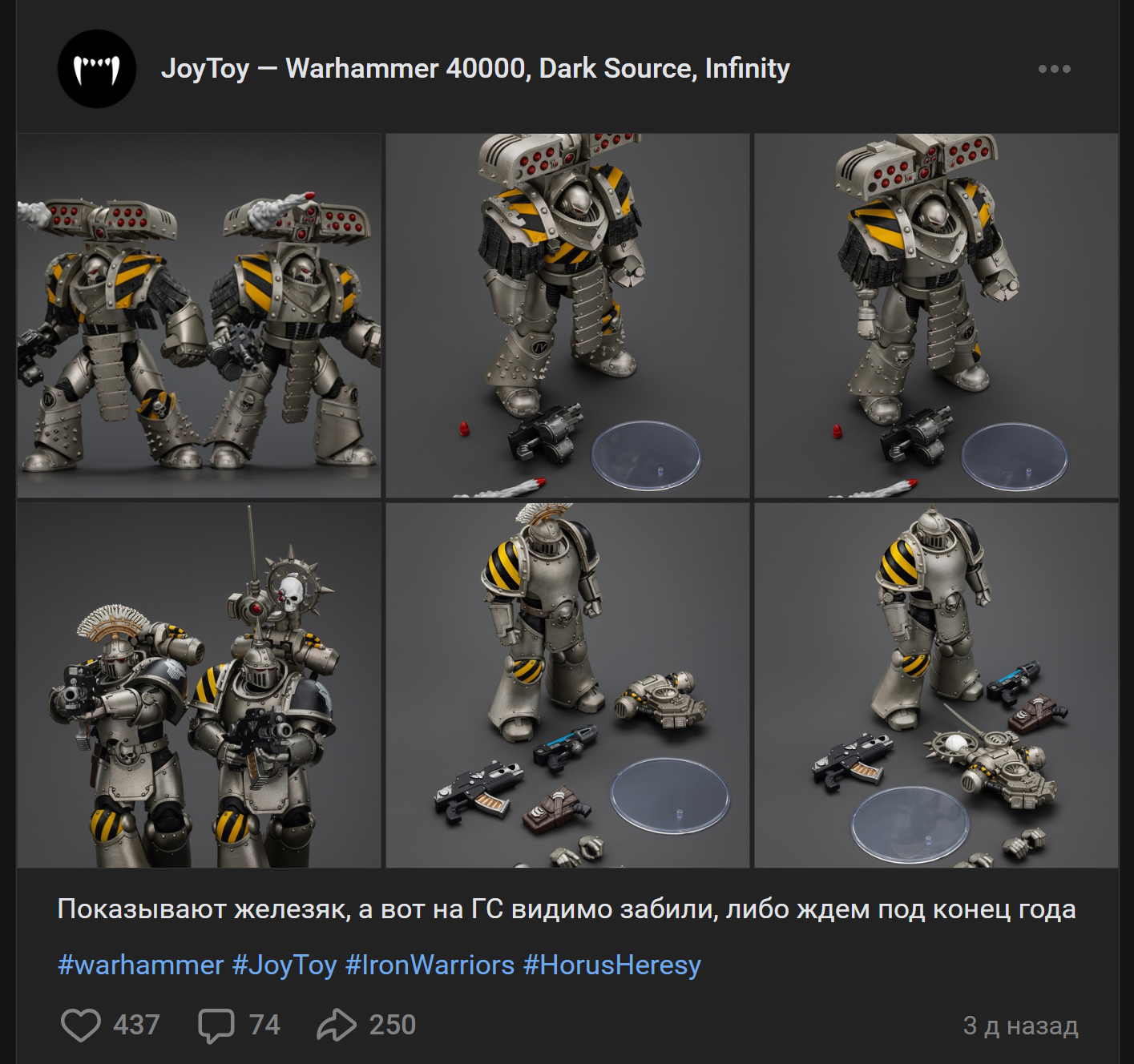 >>1135304 В районе 2-3 косарей на фигурку. Ну вот примерно в ноябре они и должны появится на всяких Озонах и прочих. Не трясись, Джои никто не скальпит особо, минус единичные фигурки, они там полгода после релиза или больше лежать будут. Насчет предзаказов в РФ были всякие группы в Вконтакте, типо таких https://vk.com/joytoy40k >Они постепенно выкатят разнообразный модельный ряд или это затянется на годы вперемешку с другими релизами? Там все непонятно, все зависит насколько тесно Джеймс Воркшоп сотрудничает с ДжойТой. По-хорошему они должны выкатить Пертурабо, их уникальный скульпт Контемптора и может еще автоматонов Железного Круга, если повезет. Еще может втиснуться новый Варсмит/Претор, которого ГВ показывали 5 месяцев назад. Думаю анонс нового Mk2 придется как минимум полгода ждать, если не больше, ибо его буквально вчера сами ГВ показали. Это если исключить возможность, что ГВ заранее Джоям передали файлы (сомнительно). >или это затянется на годы вперемешку с другими По сути да. Вот смотри, как релиз Альфа Легиона шел: Февраль 2025 анонс Альфария, их уникального Дреда и Консула Саботера Март 2025 анонс Харроумастера и Претора Апрель 2025 анонс Терминатор Претора и Лернейских Терминаторов Май 2025 анонс Эксодуса и Хедхантеров Параллельно с ними была ДОХУЯ анонсов по другим линейкам.
