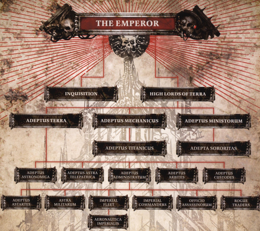 >Постоянным элементом является понятие о том, что у каждого человека есть место в божественном замысле Императора, и это выражено в иерархии Министорума. Местом подавляющего большинства является низ иерархии и беспрекословное выполнение приказов и заданий, данных свыше. Даже обладающие статусом и положением должны вести себя, будто власть и богатство являются трудностями, а не привилегиями. Не может быть никакого обсуждения официальных приказов, а совершивший подобное объявляется еретиком с той же уверенностью, что и воздвигающий хулу на Императора или вызывающий демона посреди проповеди кардинала.