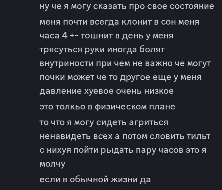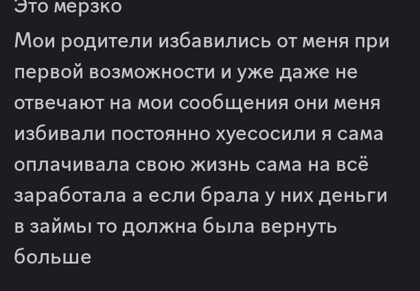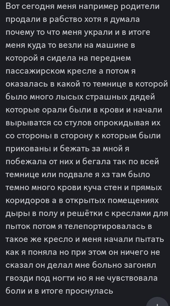 >>962940 Вот скриншоты переписки с одной девушкой с Одессы имеющей цыганские корни, все сообщения были 1-2 года назад ,я наивный и никогда не предавал им значения как и ее личности. На скринах отношения ее родителей, кроме избиений до ГЕМАТОН и КРОВИ смущает ЕСЛИ БРАЛА ДЕНЬГИ ДОЛЖНЫ БЫЛА ОТДАТЬ БОЛЬШЕ. Так же описание ее здоровья сейчас. У нее была кома в 13 лет с потерей голоса навсегда вроде бы в результате аварии, не знаю точно.Несмотоя на все это ОНА ОЧЕНЬ СПОСОБНАЯ И УМНАЯ, отлаживать деньги она начала как раз в 14-15 лет дабы обрести финансовую независимость и сьебать от предков, в 17 отец перевез ее в другую страну где она самостоятельно продолжает жить, в 18 она разобравшись в криптовалюте ПРИОБРЕЛА ДОМ ЗА 100К ЕВРО КОИ ЗАРАБОТАЛА САМА И НЕ СЧИТАЕТ ЭТО ОГРОМНОЙ СУМОЙ. Школа у нее не окончена, говорит что ВСЕМУ НАУЧИЛАСЬ САМА при этом ОНА И ВПРЯМЬ ОЧЕНЬ УМНАЯ, МНОГО ЗНАЕТ ,ИМЕЕТ ОЧЕНЬ ХОРОШУЮ ПАМЯТЬ, в школе была попытка надругательства над ней, но все обошлось. Несмотря на проблемы с психикой отличная внешность, отсутствие татуировок пирсинга, вредных привычек начиная с банальных по типу курения,алкоголя. Контакт с родителями утрачен что видно в сообщении >>962949 Вся информация была написана ей ИСКРЕННЕ БЕЗ ПРЕУВЕЛИЧЕНИЙ Я ТОЧНО УВЕРЕН. Оцени пожалуйста сон, ее семью , происхождение , ее странные способности к обучению в результате чего она добилась таких успехов. ПОЖАЛУЙСТА ЕСЛИ ВОСПРИНИМАТЬ ВСЕ ЭТО СЕРЬЕЗНО, ЧТО МОЖНО ПРЕДПОЛОЖИТЬ ИЛИ НАДУМАТЬ ПО ПОВОДУ СТРАННОГО ОТНОШЕНИЯ ЕЕ РОДИТЕЛЕЙ, СНЕ, ЕЕ ИНТЕЛЛЕКТУАЛЬНЫХ СПОСОБНОСТЕЙ СПОСОБСТВУЮЩИХ ТАКИМ УСПЕХАМ В 18 ЛЕТ Могли ли ее родители отдать в детстве кому то для событий из сна? Странная кома в 13 полная потеря голоса? Неясно помнит и имеет пробелы в памяти до 8-9 лет. Ее интеллектуальный способности,память и успехи в 18 могут быть следствием чего то? Просто скажи это бред и никакой хуйней такой человек не мог быть связан?