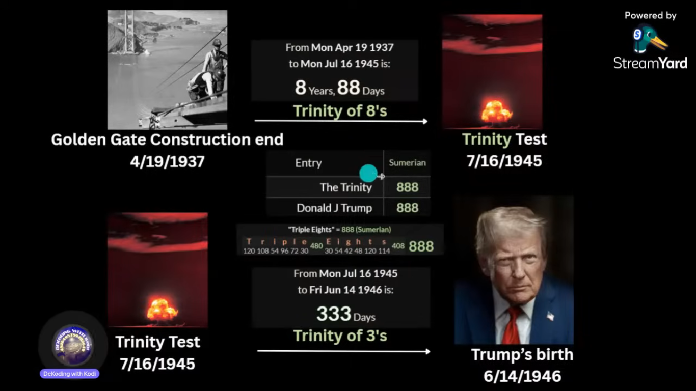 Трубецкой родился в день пи (3/14). Умер спустя 4 месяца и 18 дней после своего др (8-я буква иврита хет напоминает греческую букву пи, гематрия хет = 418). 4 месяца и 24 дня или 146 дней с даты операции "Труба". Одно из значений фамилии Трампа - "играть на трубе". "146" как день рождения Трампа 14 июня, Трампа сравнивали с "Машиахом бен Давидом", гематрия полного имени Трампа как и Машиаха равна 424.
