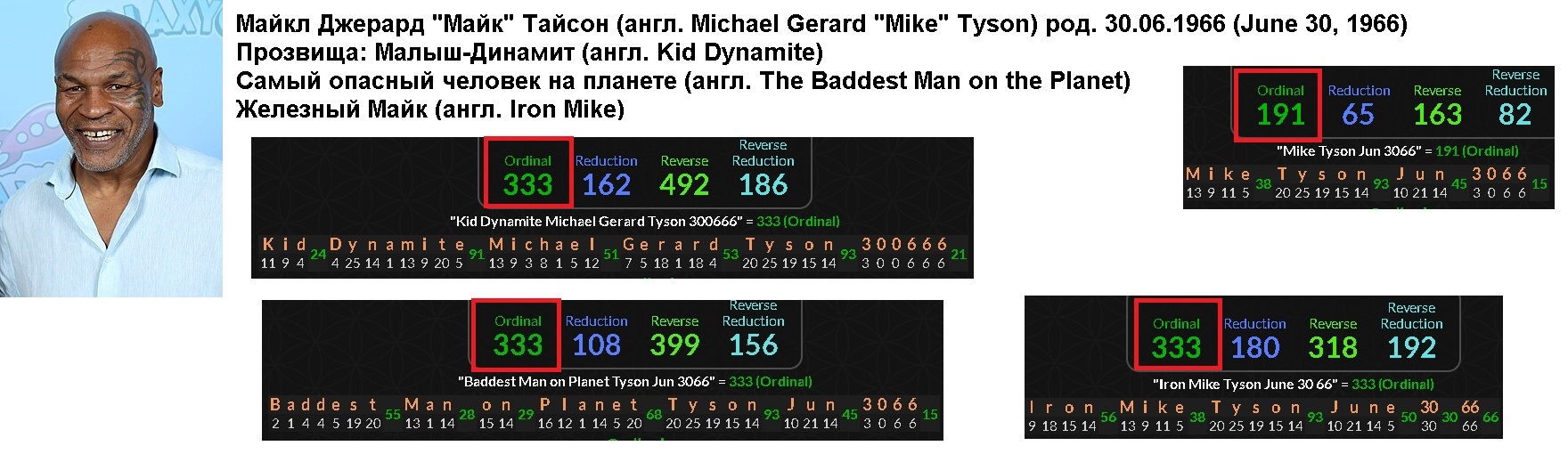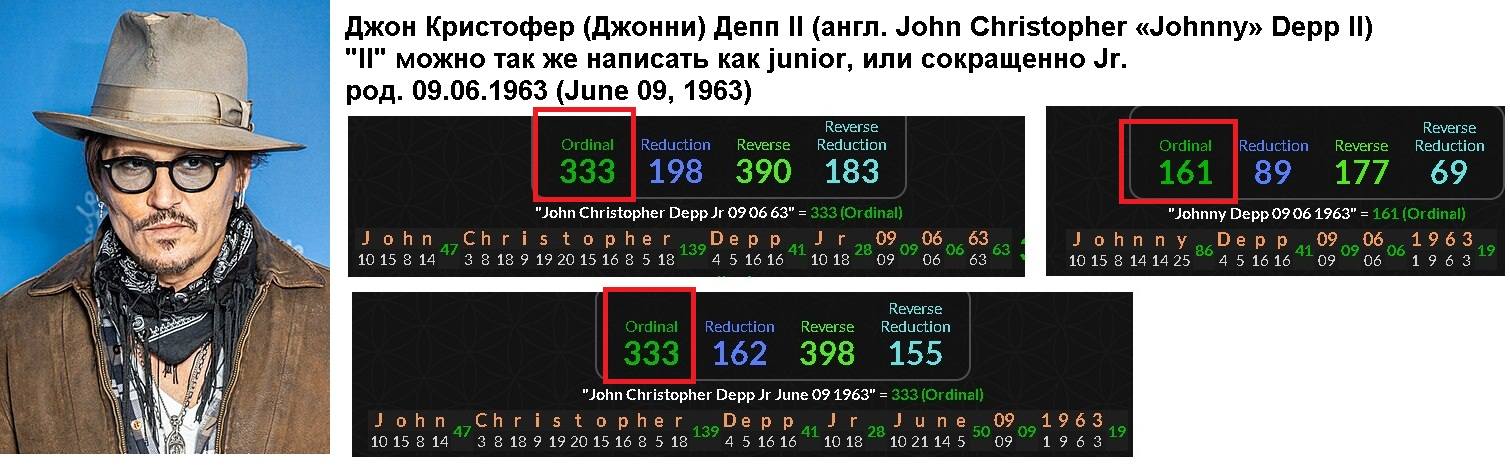 >>962887 Извини, что поздно пишу. Обычно отсматриваю сей тред полностью и отвечаю боль-мень адекватам. >Как ты это считаешь? https://ru.wikipedia.org/wiki/Гематрия Это 4 варианта счета гематрии. Каждой букве можно сопоставить цифру. Это давняя традиция и наиболее распространена она у хебреев. Но и с церковнославянским языком она тоже дружит, т.к. исток-то у них у всех один. Согласно этому методу, у всех букв имеется числовой эквивалент, а значит слово это число (в данном случае их 4 штуки, в зависимости от того, как считать). ЗОГ для своих проектов зачем-то выбирает людей с нужными именами, названия местностей, названия объектов, а так же даты -- все это выбирается, в том числе, с таким рассчетом, чтобы они в сумме выдали нужные цифровые коды. В первую очередь их интересует т.н. "число зверя": 666. А так же его фракталы, т.е. составные части, как 111, 222, 333 и т.д. Насколько сейчас можно сказать, таким методом помечены многие т.н. "селебрити" и прочие знаменитости, а так же участники цеховых игрищ и вообще глобального спектакля. Густо помечена ядерка, ее испытание и применение. А так же весь КОЦМАС и все что связано с "шарообразностью" Земли (скорее всего реально плоская, лол). >Если я хочу себя проверить, что мне нужно сделать? Можно вручную подсчитать на какуляторе, это наиболее надежный способ. Но для скорости и простоты можно воспользоваться онлаен - калькулятором: https://gematrinator.com/calculator На втором пикриле видно, как помечен всемирноизвестный Джонни Депп, он же Джон Кристофер Депп второй, он же джуниор, сокр. Jr. Это без всякого сомнения один из рабочих методов ЗОГкулисы. Подсказал его небезызвестный Шегалов, которого хают в соседнем треде цеховым. Однако скажу, что то, что он подкинул реально использующийся закулисой метод ВНЕЗАПНО не делает его не цеховым. Может метод уже дискредитирован на том же Западе, вот его и решили немного сливать. Не смог найти никаких кодов в именах Греты Тунберг, Оззи Осборна, а сейчас еще и Тома Хэнкса. Последний, ВНЕЗАПНО, православный христианин. Думаю посмотреть как пометили самого известного саентолога Тома Круза.