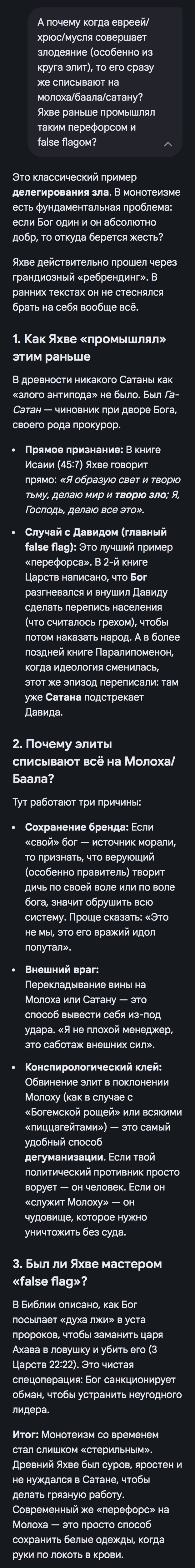 > Баа́л, или Ваа́л (общесемит. baʿl, финик. 𐤁𐤏𐤋, др.-евр. בעל — «хозяин; владыка»), — эпитет «бог, владыка» для разных богов в западносемитской мифологии. А нахуя тогда (((конспирологи))) говорят, что жиды покланяются баалу, если это просто слово бог? Почему они хуцпят, вертят жопой, но никогда не скажут очевидную истину, что жиды поклоняются всеми нами известному богу ЯХВЕ? > Моло́х, также Мо́лох, также Молех (лат. Moloch, греч. Μολόχ [Молох] ← ивр. מולך [Мо́лех] «царственный»), у аммонитян Милхом[англ.], — упоминающееся в Библии божество моавитян, ханаанеян и аммонитян (3 Цар. 11:5, 11:7), которому приносили в жертву детей (Иер. 7:31); по-видимому, мог обозначать эпитет верховного божества, так же, как и Баал (соб. «владыка»). Опять же, бог опущенных в Торе народов, нахуя жидам ему поклоняться. Это все коррелирует с тем, что как минимум семитские боги часто изображались рогатыми, поэтому спутать их легко и Яхве этим пользуется. Жиды делают жертвоприношения -> это вскрывается -> конторское говно начинает перефорсить по всему интернету, мол это они не Яхве молились, а Баалу/Молоху/Сотоне, поэтому давайте, продолжайте ходить в церковь/мечеть и не задавайте вопросов о вашем владыке