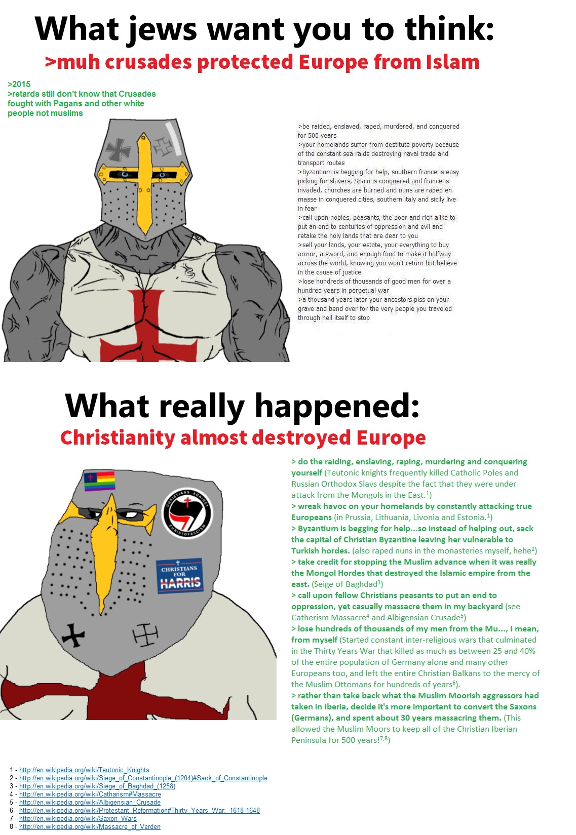 Да хватит форсить этот бред. Христианство или было распространено и придумано другими силами (не евреями). Или в худшем случае евреями, но вышло из под контроля. В треде выше есть, сколько раз христиане убивали и гнали евреев. Ну и мне так на вопрос не ответили, почему якобы всемогущие евреи веками не могли себе страну создать.